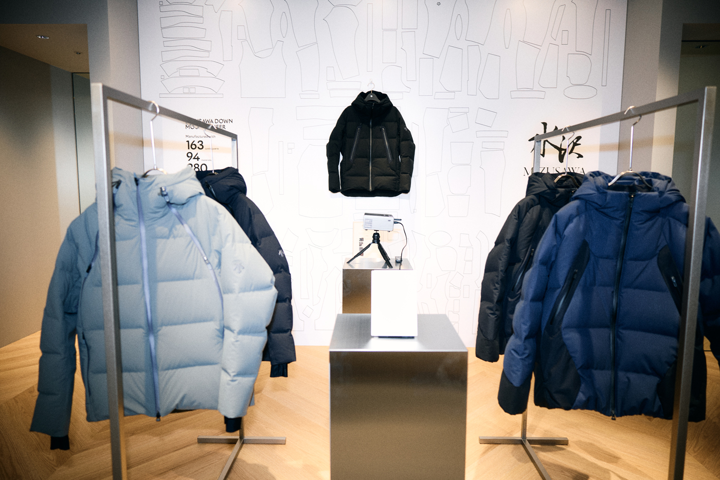 2階のフロアには、〈DESCENTE〉を特にファッションの面で牽引する水沢ダウン、そしてその水沢ダウンの存在がきっかけとなって生まれた〈DESCENTE ALLTERRAIN(デサント オルテライン)〉などのプロダクトが豊富に揃う。水沢ダウンは、デサントアパレル水沢工場にて生産されるダウンのことを指し、特殊な技術やノウハウをふんだんに注ぎ込んでいる。圧巻なのは、多くのファンを抱える水沢ダウンのMOUNTAINEER(マウンテニア)というモデルの、生産過程の展示だ。壁一面に配されているのは、163のカッティングのパーツの絵型。こちらを94種類の素材を用いて、280にも及ぶ工程数によって完成させていくという。途方もない緻密な作業によって、ユーザーとの信頼を築いてきた、圧倒的なクオリティが垣間見えるのだ。