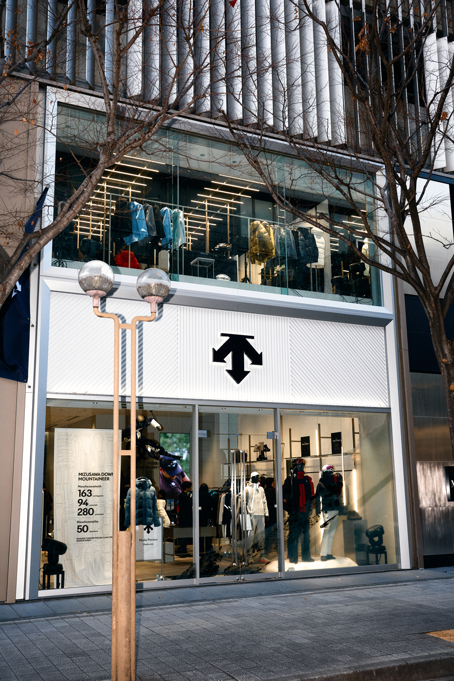 水沢ダウンという響きから、どうしてもダウン自体のスペックなどを想像してしまうこともあるが、実際にはプロダクトのディテールへの探求が、その立ち位置を確かなものにしている。こうしたモノづくりへの姿勢は〈DESCENTE ALLTERRAIN〉全体でしっかりと表現されており、機能を追求した先にある、デザインの痕跡がブランドらしさとなって現れるのだ。プロダクト全体の佇まいはもちろんだが、何よりさまざまな細部でのアクセント、しかもそれは目に見えて派手なものではないことが多いのだが、そうした部分にこそブランドの美学をひしひしと感じられる。たとえば水沢ダウンのTRIDENT(トライデント)というモデルでは、パラフードと名付けられたワンタッチでのフードの収納システムを採用している。それ以外のプロダクトでも、袖口の通常マジックテープの仕様になっていることも多い、フィッティング調整用の部分が、濡れや摩耗対策で凹凸の素材のみで調整できるようになっていたり、保温に優れた生地の面積を増やすための構造が、デザインのアクセントになっていたりすることもある。ファッション以外の分野で用いられている技術を活かすことも多いそうだが、こうしたアイデアの転換が、実用性とユニークなデザインの双方を可能にしている。そして背景にある圧倒的な技術力や、アイデアの結晶を誇示するでもなく淡々と、使用する人にとってポジティブな影響を与えられることを目指したアップデートを重ねていく姿勢は、ブランドに流れるDNAとでも言えるだろうか。スポーツブランドとしての最先端を追求する側面と、ファッションシーンでも同様に技術を用いて、新たな価値観をつくっていくというアプローチ。両軸を知るからこそ楽しめる、〈DESCENTE〉の魅力に、店舗を通じて触れていただきたい。