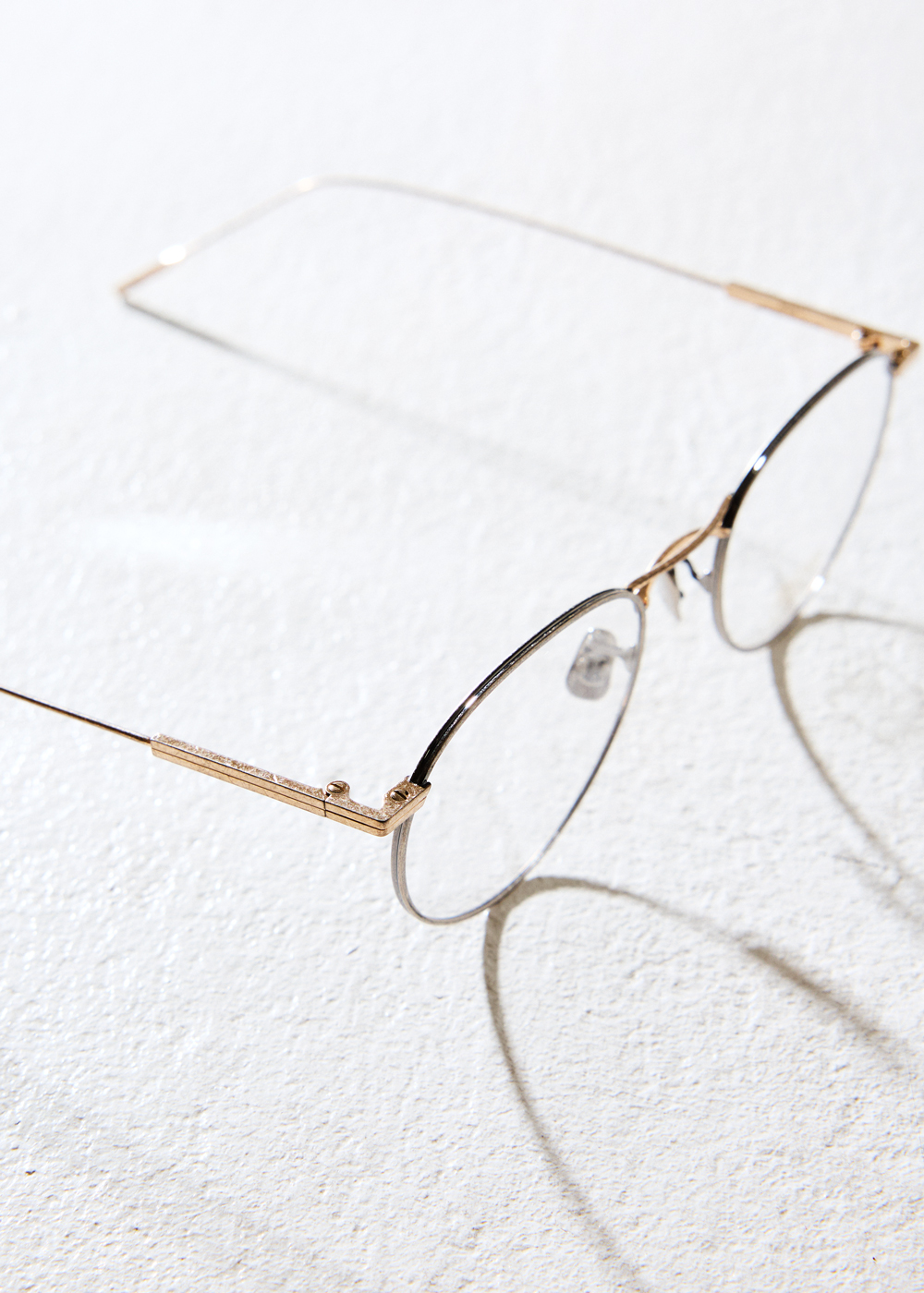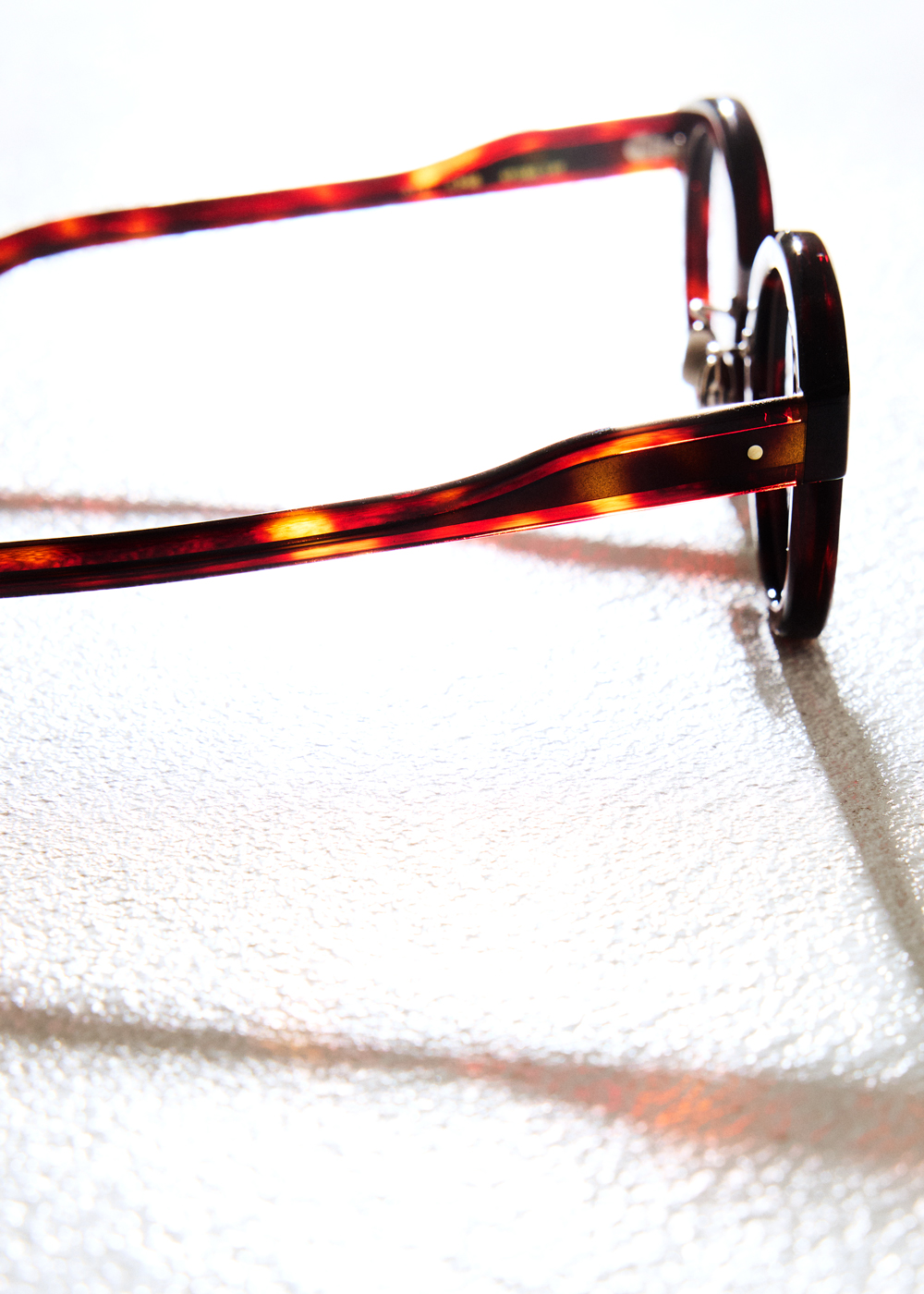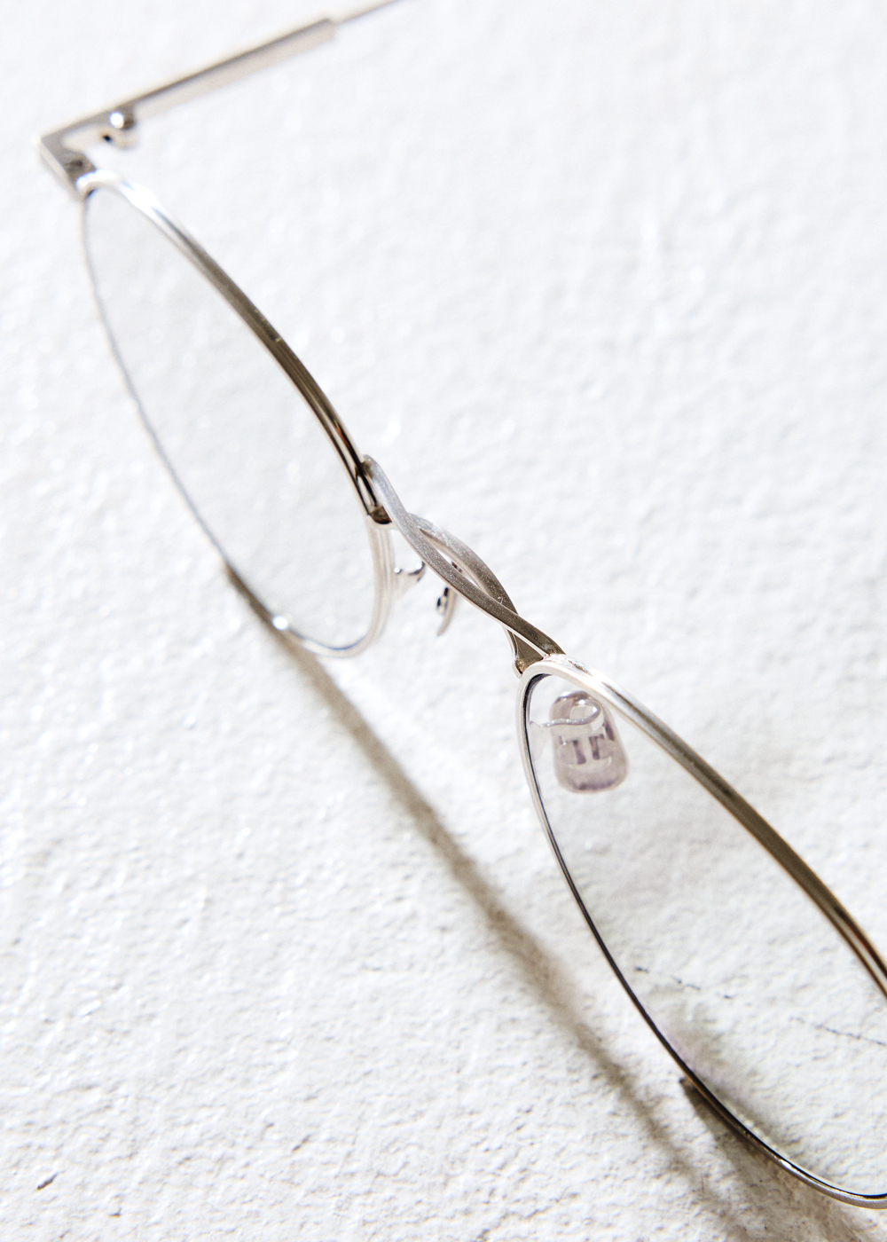 アイテムの説明をする際に、基本的に“唯一無二”や、“逸品”といった表現は、時に過剰になってしまい、全体像を正しく把握できなくなる恐れもあり、避けているのだが、〈EYEVAN 7285〉のプロダクトに関しては、そうした表現が適切だと思わされる場面が多々ある。こちらの『374』はテンプル部分の絶妙なシルエットの調整のために、技術の進化と人の手の双方を用いて、まさに唯一無二の表現を獲得した。最先端の追求や、クラシックの再現という一方向的な手法を目にする機会は多いが、『374』が実現したのは異なる文脈を掛け合わせたアプローチ。時代が進化することを否定するのでも、過去を手放しに礼賛するのでもなく、過去にも目を向け現在だからできる手法を洗い出し、未来に向けたモノづくりを体現する。だからこそ『374』はじめ、〈EYEVAN 7285〉のプロダクトの数々は、どこか時間を経てきたような懐かしさと、まだ見ぬ新しさが同居する。