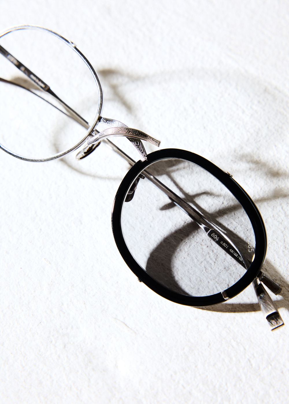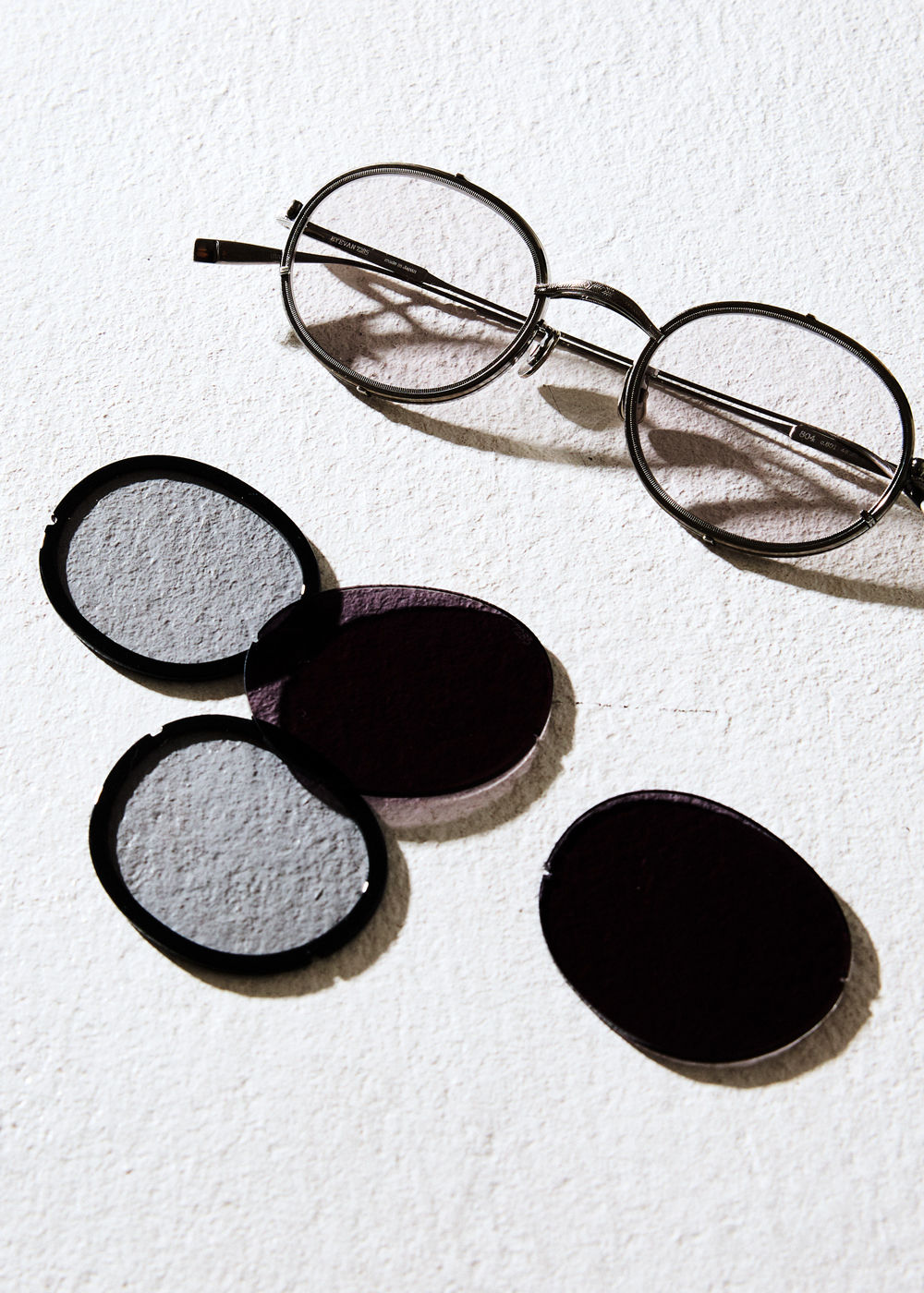 『739』という2パターンレンズを変えることができる従来のモデルをアップデートして、登場した新作。時計のリューズのように、ブリッジ部分を稼働させてレンズを交換できるという仕掛けが、メカニカルな遊び心を与える。仕組みこそ従来のものと同様だが、稼働するブリッジ部分のネジの長さ、テンプルの模様やシルエット、リムのレンズをホールドする部分のサイズの変更など、さらなる完成度の追求に余念がない。セルとメタルの素材が異なるコンビネーションから、メタルのみのソリッドな表情など、レンズを変えれば、全く異なる表情を見せる。デザインとして散りばめられた遊びをさらに引き出すのは、着用する人々の自由なアイデアとも言えるだろう。