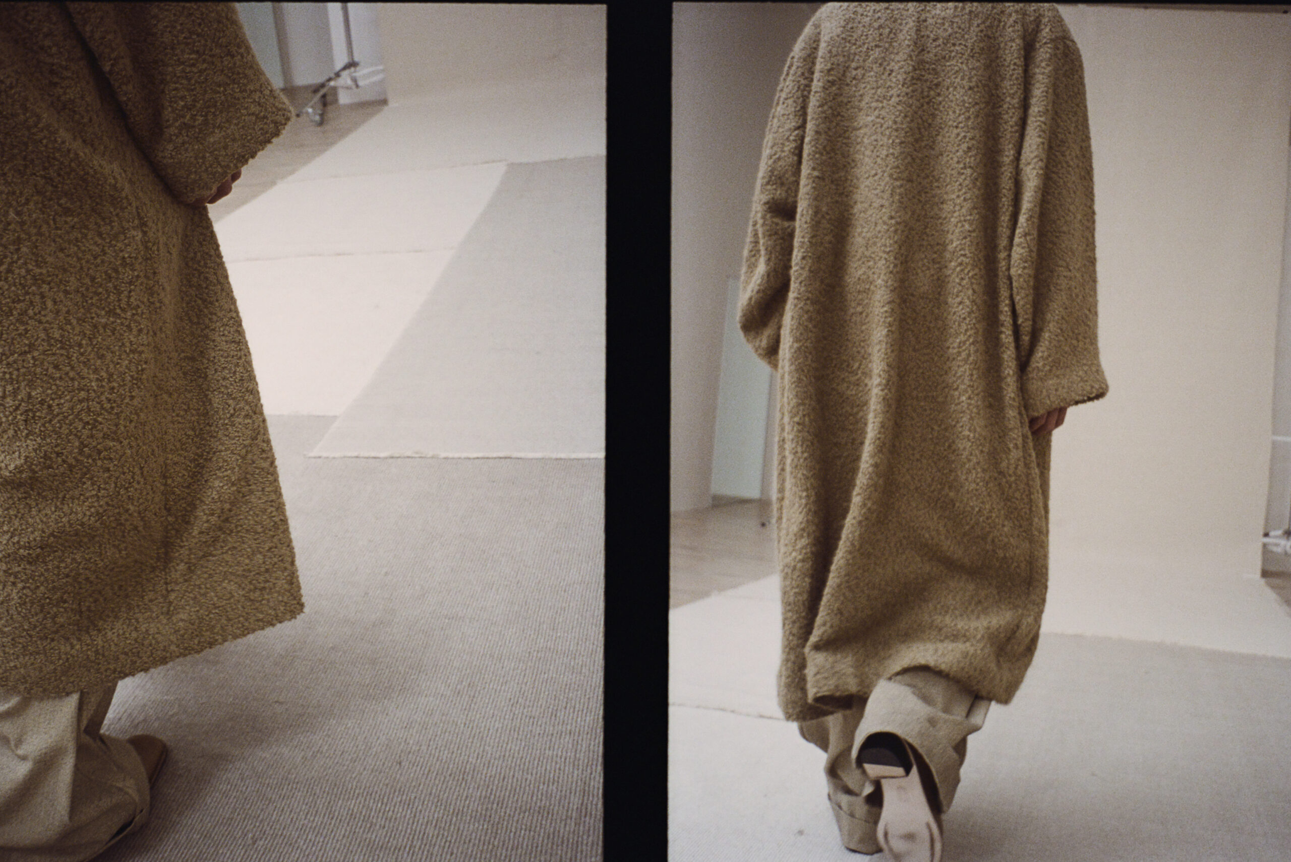主役は、視線の行き先を決める。どこを見るべきかを、迷う余地なく示してくれる存在だ。しかし、何かが主役として立ち上がるとき、その背後には必ず脇役がいる。服づくりにおいて、その後者に置かれがちなもののひとつが素材だ。一般的に服づくりの工程では、デザインが決まり、シルエットが決まり、最後に素材が選ばれる。あるいは素材から出発したとしても、それはデザインを成立させるための素材として扱われてしまう。いつの間にか、素材は誰かの意図を実現するための手段になっている。素材とは、その価値を十分に引き受けられないまま、背後へと退いてきた存在でもある。クリス・ファイヤオブド「まずテキスタイルのスウォッチをつくって、その素材で何ができるかをもとにガーメントを作っていく。またあるときは逆で、コンセプトに合う完璧な素材を探していく」。それでもやはり、向かう先を決めているのはつくり手だ。スウォッチからはじめるにせよ、コンセプトからはじめるにせよ、どちらが先であっても、素材は導かれる側にある。そうした関係は、〈LAUREN MANOOGIAN〉の制作においても一見当てはまる。ローレン・マヌーギアン「コレクションをつくる過程では、常に多くのことが変わっていくから。創造のプロセスには柔軟に応答できなければいけない。いわゆるハッピーアクシデントが生まれて、新しい思考の方向性を示してくれるときだってあるの」。糸の状態ひとつで、落ち方や手触りが変わる。熱で縮み、引けば伸びる。彼らが扱う天然素材には、それぞれ固有の性質がある。同じように扱っても、決して同じ結果にはならない。そうした振る舞いを前にすると、つくり手が一方的にすべてを決めている、とは言い切れなくなる。むしろ、その反応を見極めながら、対話するように判断が重ねられていくからだ。ローレン・マヌーギアン「私たちの中心には、素材がある。常に素材にとってベストでありたい。素材がなりたいものを引き出したいと思っている。天然素材は時間をかけて、個性をもっていくように変化するから。使えば使うほど、その人の生活に馴染んでいく」。素材には、なりたいかたちがある。つくり手の仕事は、それを実現することだ。デザイナーのビジョンに素材が従うのではなく、素材の振る舞いにつくり手が応じていく。主役は、つくり手の意図ではなく、素材の意思によって引き出される。
